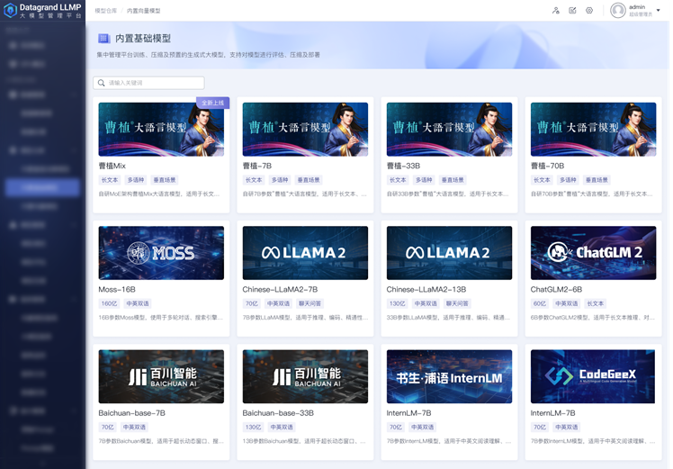 覆盖自研曹植大语言模型,另附多种开源大模型,如LLaMA2、ChatGLM、baichuan、InternLM增加模型选择维度,并支持扩展